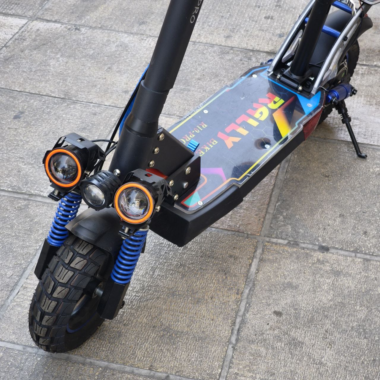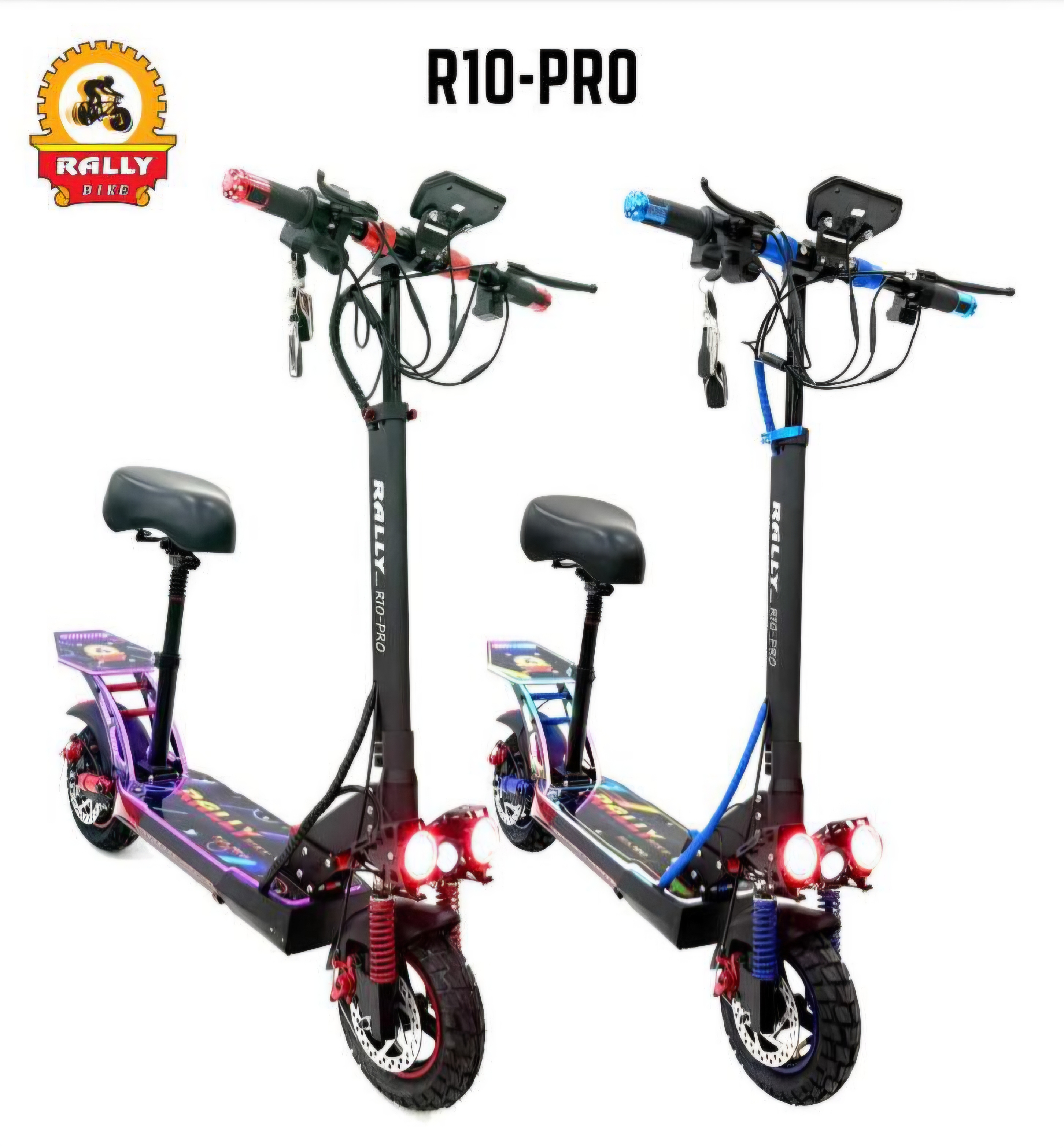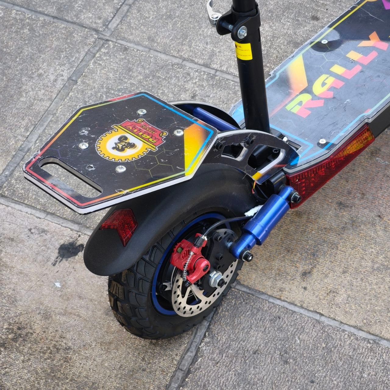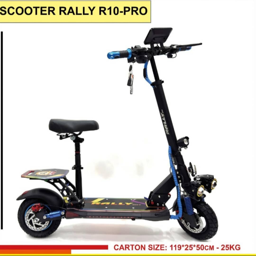 اسکوتر برند رالی Rally مدل R10_pro 2000 وات 48 ولت 15 آمپر ترمز جلو و عقب دیسکی کمک فنر جلو و عقب برای سواری نرم و راحت حداکثر سرعت 70 کیلومتر بر ساعت مسافت طی شده با هر بار شارژ 35 الی 50 کیلومتر با توجه به وزن راننده و شیب جاده