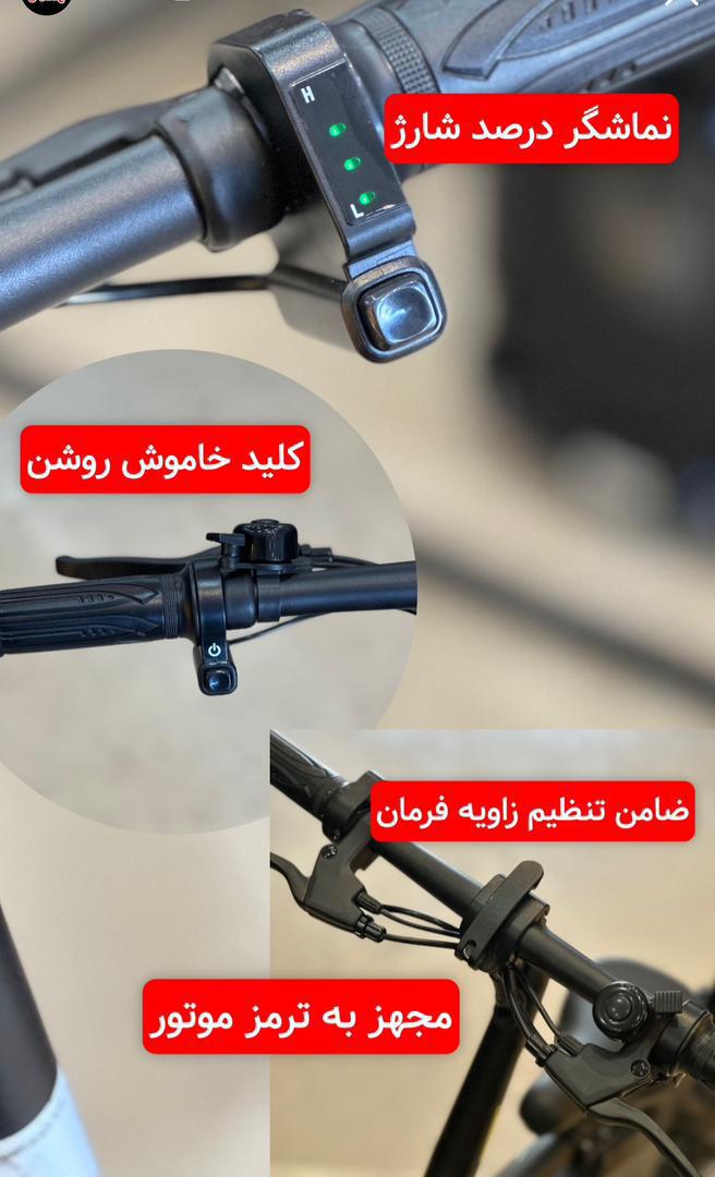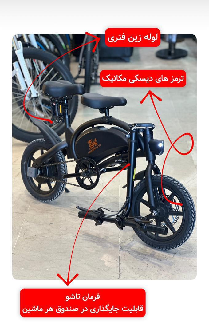 موتور کوگو برند امریکایی موتور ۴۰۰ وات پر قدرت تمام تاشو از قسمت فرمان دارای صندلی کودک لوله زین فنری دسته گاز موتوری نمایشگر شارژ چراغ جلو led پیمایش با هر شارژ ۳۵ تا ۵۰ کیلومتر تحمل وزن ۱۲۵ کیلو باطری ۳۶ ولت لیتیومی اورجینال